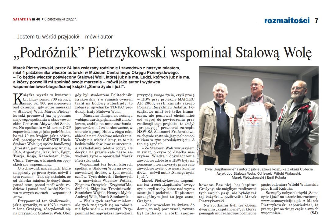 PIETRZYKOWSKI Z FASONEM. Pan Marek Pietrzykowski opublikował fascynującą książkę. Niepokorny inżynier z Huty Stalowa Wola opisał nie tylko swoje barwne nietuzinkowe życie, z reguły pod prąd głównemu nurtowi, ale także stworzył dokument. Pisany żywym soczystym językiem. Zapis ten dotyczy w szczególności realiów polskiej strategicznej gałęzi przemysłu w dobie PRL i okresu kształtowania się w naszym kraju wraz z transformacją nowej rzeczywistości.